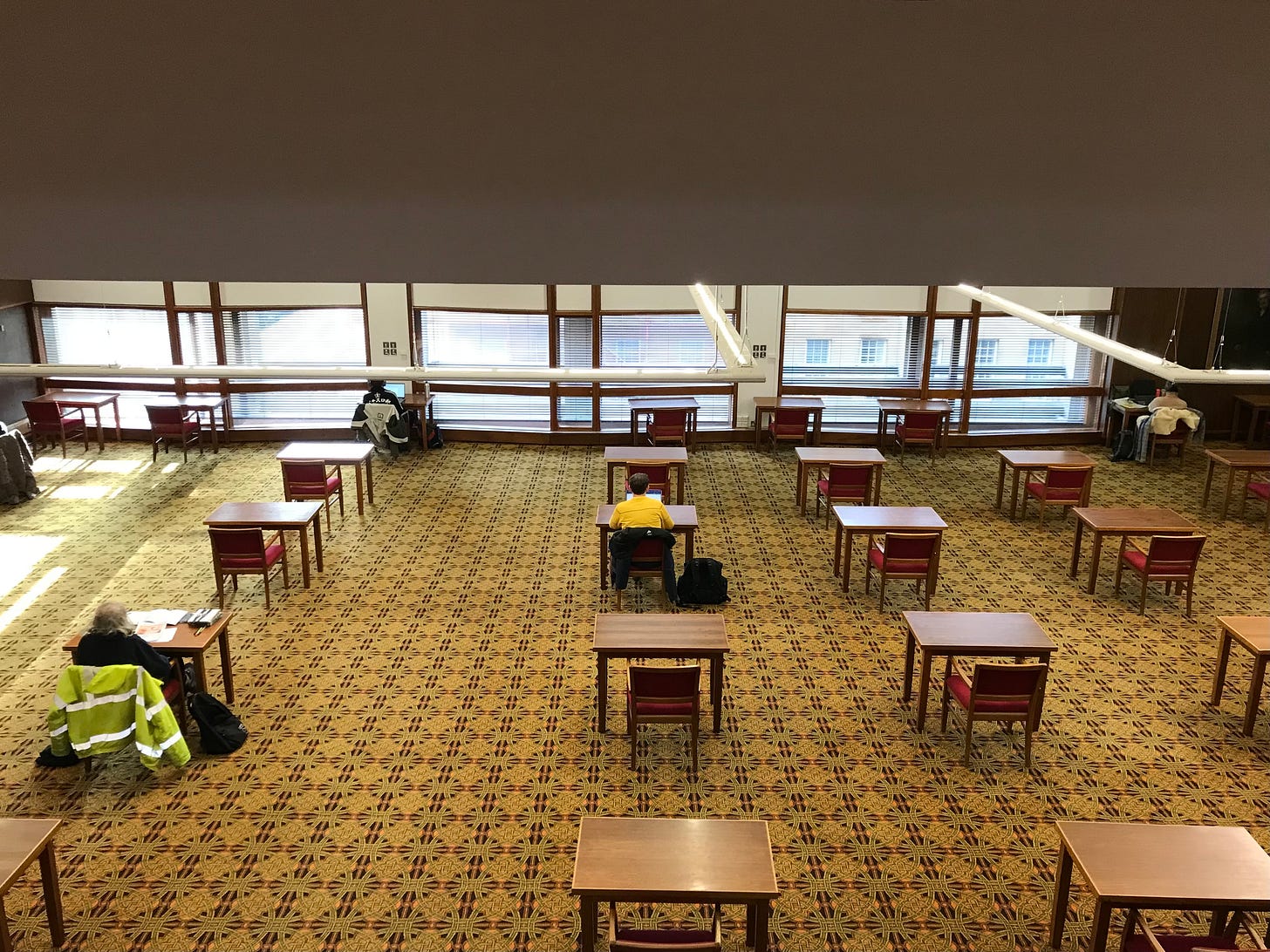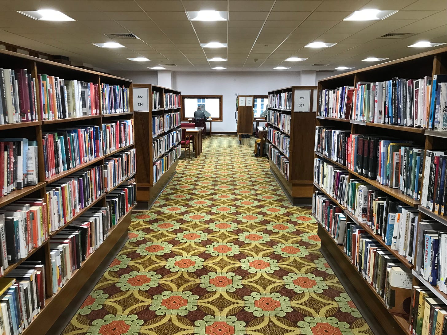On my most recent visit I counted eight designs. The stair carpet – a bubbling red and black – gave the impression that a volcano had erupted somewhere above and was flowing down through the building. Low sun slanted in the windows of the Reading Room and made the celtic knots on the carpet glow. It was the coldest day of winter. Everyone seemed glad of the free heat. An old man dozed in front of a computer, waking every few minutes to sing gently along with The Dubliners on YouTube. A young woman in a hijab, laying down her mat in an alcove near the lifts, bent and rose in prayer.