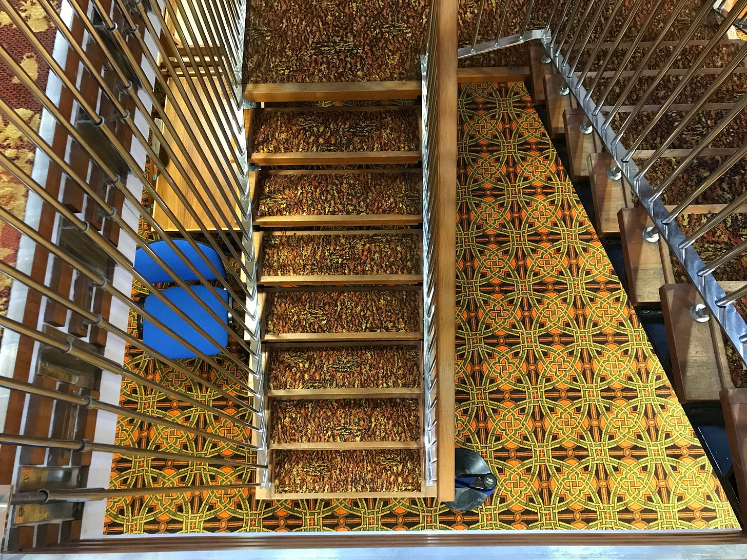 They can be seen on floors two through to five of this elegant Glasgow building. Actually, ‘seen’ is the wrong verb. Better to say ‘experienced’ or, depending on your taste, ‘endured’. They help keep the library quiet, deadening footsteps, but are themselves the loudest thing in the place. They are psychedelic; a happening, a trip.